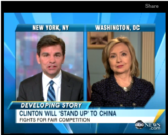 SECRETARY CLINTON: Well, George, let me say first that I think Americans need to put this relationship into perspective. Our economy is about three times the size of the Chinese economy, where they have four times the number of people. So our standard of living is much higher, our innovation, our creativity – all of that is really to America’s advantage.