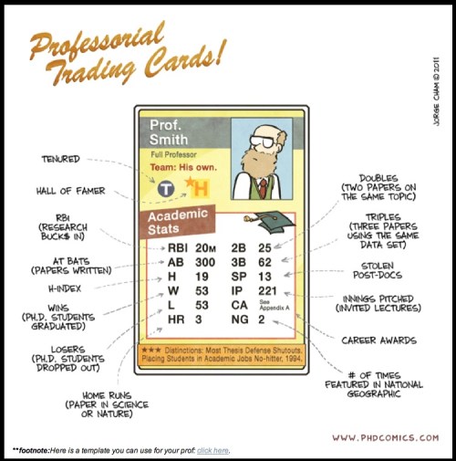 …and professors had bubble-gum cards vaunting their stats. From the comic geniuses at Piled Higher and Deeper: